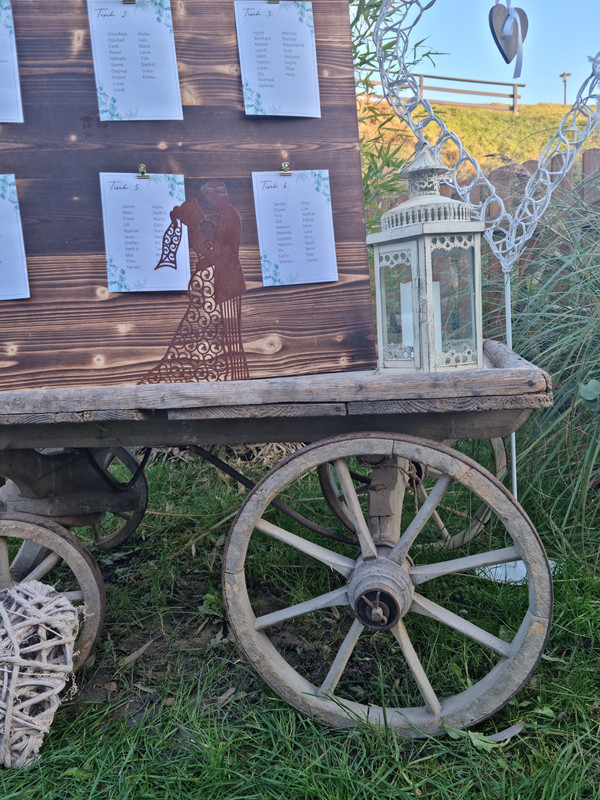 Dieser Bollerwagen flach ist nicht nur ein hübscher Hingucker, sondern sorgt auch für eine reibungslose Organisation an Ihrem großen Tag. Unsere hochwertigen Bollerwagen sind zur Miete verfügbar, ein ideales Detail, um Ihrer Traumhochzeit einen einzigartigen Touch zu verleihen.