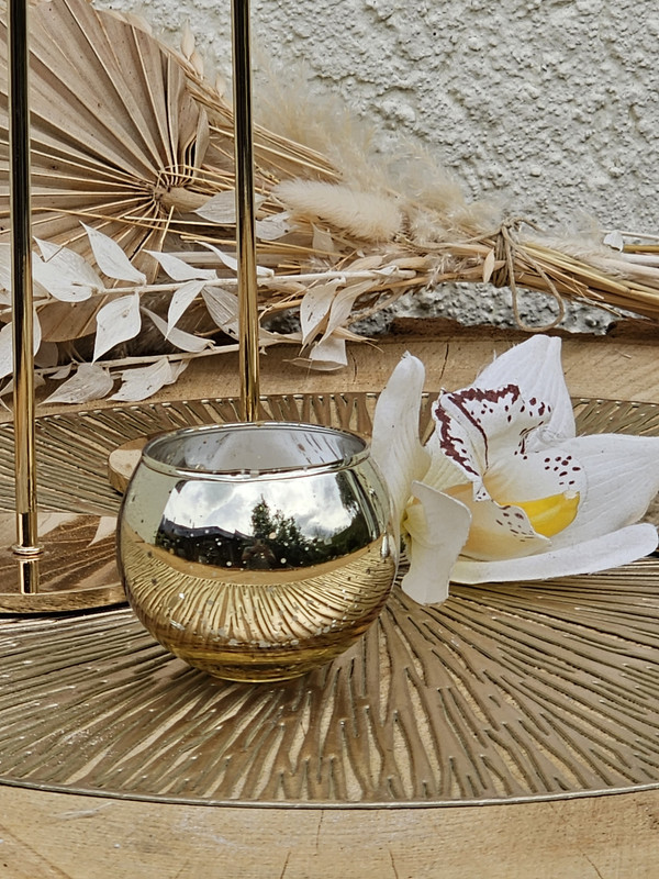 Unser vielseitig einsetzbarer Teelichthalter zeichnet sich durch sein kunstvolles Glasdesign aus und ist von einem sanften Goldenen Schimmer umgeben, der bei Kerzenlicht wunderschön funkelt. Durch dieses dezente, aber raffinierte Detail, wird jedem Raum oder Tisch eine gemütliche Atmosphäre und ein Hauch von Romantik verliehen. Dieser Artikel ist nicht nur optisch ansprechend, sondern auch sehr funktionell – er schützt Ihre Teelichter und sorgt für eine gleichmäßige, warme Beleuchtung.